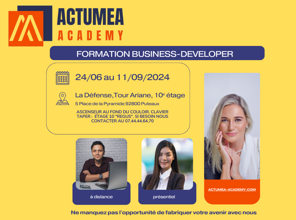 INSCRIT À FRANCE TRAVAIL ? ACTUMEA ACADEMY - FORMATION BUSINESS-DEVELOPER Du 24 juin au 11 septembre 2024 La Défense, Tour Ariane, 10ᵉ étage5 Place de la Pyramide, 92800 Puteaux Accès...
